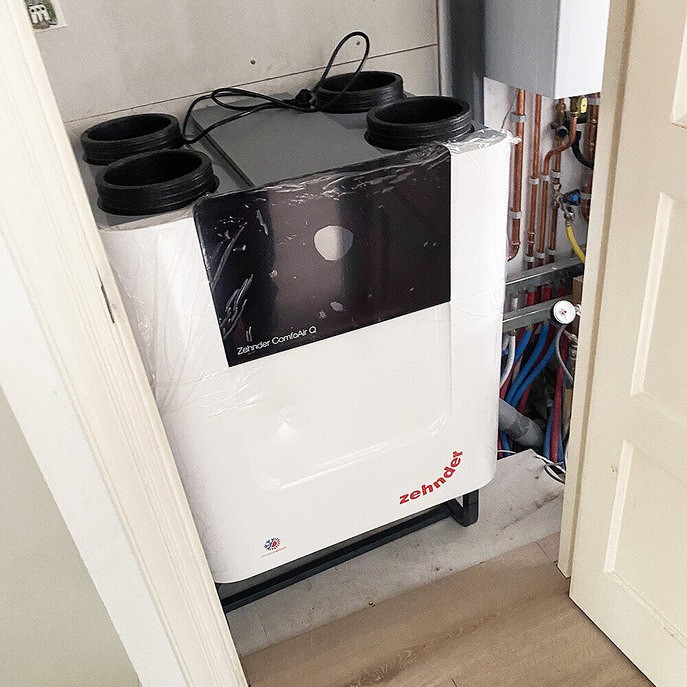 Mission air sain dans la maison : pour cela, on a fait appel à l'appareil Zehnder ComfoAir Q wtw. Un bon choix, car cette unité de ventilation économe en énergie rend la maison nettement plus durable. En outre, le choix s'est porté sur le ComfoClime, une pompe à chaleur air-air qui fournit un supplément de refroidissement ou de chaleur par le biais de la ventilation. Ainsi, il fait un peu plus frais en été - et la climatisation ne doit pas fonctionner autant - ou vous pouvez profiter d'un air plus chaud à la maison en hiver.