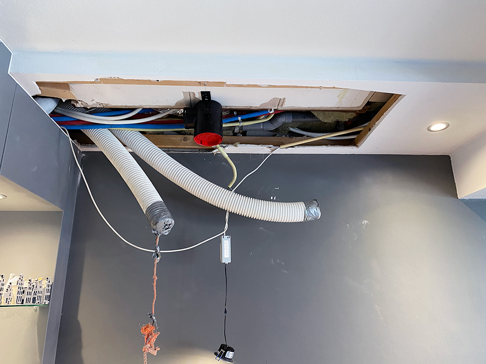 Le plus grand défi ? "C'était le bâtiment existant", explique Bert Thuijs, de l'entreprise d'installation Gofilex et propriétaire des lieux. "L'étage mansardé était une toile vierge, je pouvais donc pratiquement y faire ce que je voulais. Cependant, le défi consistait à installer le système de distribution d'air dans toute la maison. Il en va de même pour le rez-de-chaussée, qui n'a pas été aménagé. En particulier, l'installation de la ventilation jusqu'à la salle de bains du rez-de-chaussée a été un véritable défi. Heureusement, il y avait juste assez d'espace pour installer les conduits derrière la douche, en passant par les toilettes du rez-de-chaussée."