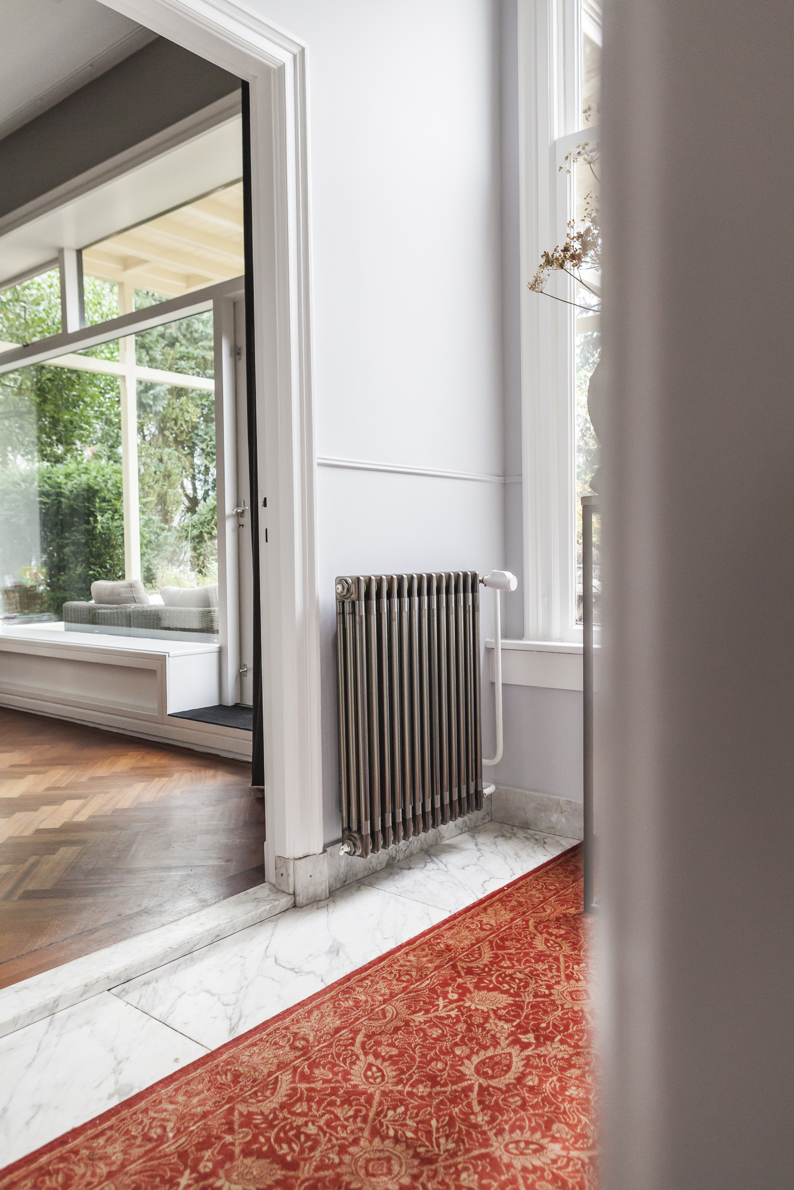 Une étape importante de la rénovation a consisté à trouver une solution de chauffage. Le chauffage par le sol n'étant pas autorisé dans ce monument, il a été décidé de remplacer les radiateurs authentiques et fortement rouillés par des radiateurs Zehnder Charleston fabriqués sur mesure. Ces radiateurs conviennent à un système de chauffage basse température économe en énergie et s'intègrent parfaitement au caractère historique de la villa. « L'avantage des radiateurs Zehnder Charleston est qu'ils peuvent être entièrement personnalisés », explique le propriétaire. « Chaque pièce a désormais son propre radiateur, adapté à la demande de chaleur, au style et aux couleurs de la pièce. On a l'impression de vivre dans un magazine de design ».