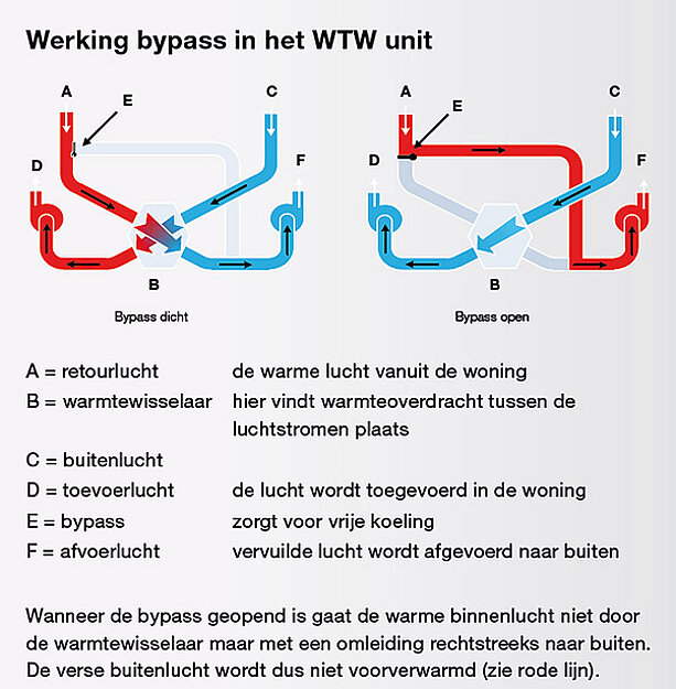Deze zorgt ervoor dat retourlucht niet door de warmtewisselaar gaat, waardoor binnenkomende koudere buitenlucht niet wordt opgewarmd en het dus koeler wordt in huis.
