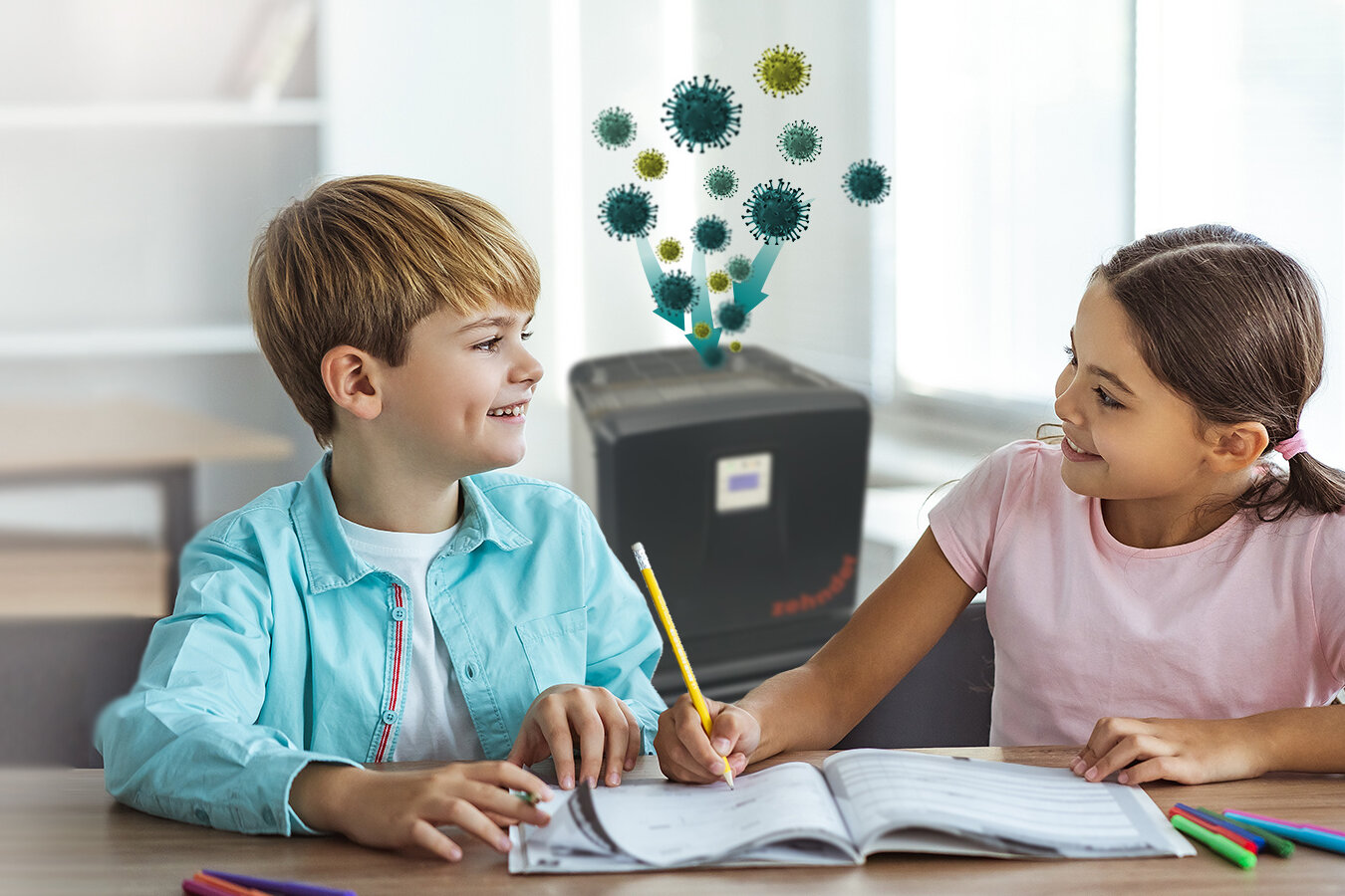 Waar ventilatie niet voldoende is, komt luchtzuivering in het spel. In klassen, collegezalen en ruimtes als sportzalen, voorleesruimtes, bibliotheken, filtert Virus Shield virussen en aerosolen actief uit de lucht. De microhygiënefilters verwijderen meer dan 99,995% virussen uit de lucht en ook andere gevaarlijke deeltjes, en is dus een goede toevoeging op het ventilatiesysteem. Dit vergroot de veiligheid van leerlingen, studenten en medewerkers.