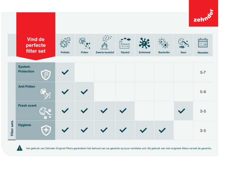 Zehnder Original filters werken efficiënter en hebben een lagere luchtweerstand dan niet-originele luchtfilters. Hierdoor hoeft het toestel minder vermogen te leveren om dezelfde hoeveelheid lucht door de filters naar de woonruimte te voeren. De originele luchtfilters van Zehnder zorgen daardoor voor een nagenoeg geluidloos systeem. Dit betekent meer wooncomfort en toch de zekerheid van een efficiënte werking van het ventilatiesysteem.